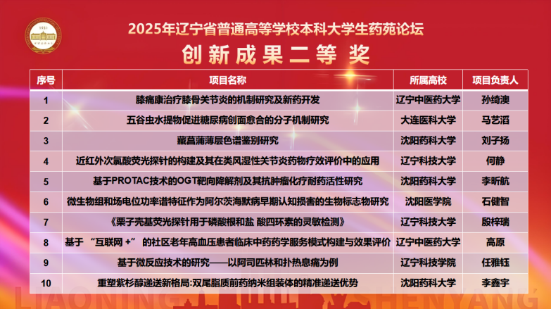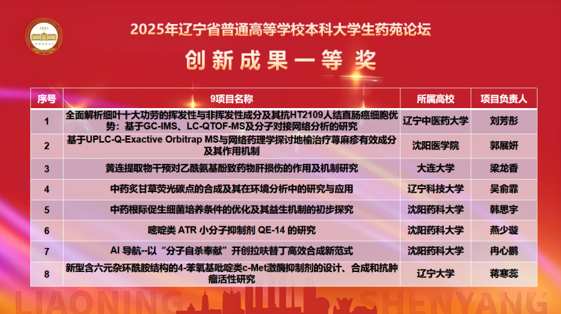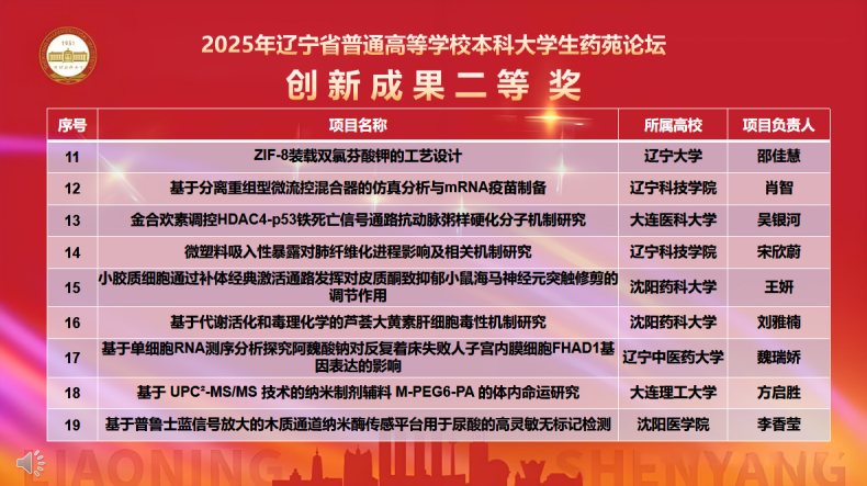 11月7日,由辽宁省教育厅主办、jdb电子中国官方网站承办的“2025年辽宁省普通高等学校本科大学生药苑论坛”在南校区图书馆国为报告厅举行。本次论坛吸引了来自大连理工大学、辽宁大学、大连医科大学等15所兄弟院校的500余名师生参赛,充分彰显了辽宁药学教育领域的蓬勃活力与深厚底蕴。山东大学、大连理工大学、辽宁大学、大连医科大学、jdb电子中国官方网站、辽宁中医药大学、沈阳医学院的专家出席论坛并对参赛项目进行现场评审。