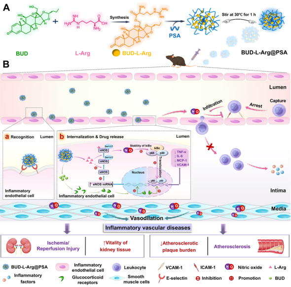 图1.BUD-L-Arg@PSA的构建及靶向治疗炎性血管疾病机制
