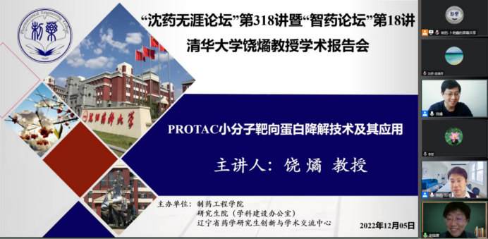 2022年12月5日下午,jdb电子中国官方网站、研究生院、辽宁省药学研究生创新与学术交流中心联合举办了“沈药无涯论坛”第318讲暨“智药论坛”第18讲,清华大学饶燏教授作了题为“PROTAC小分子靶向蛋白降解技术及其应用”的报告。会议由制药工程学科副主席刘洋教授主持,学院领导班子成员、研究生导师和研究生近300余人参会。