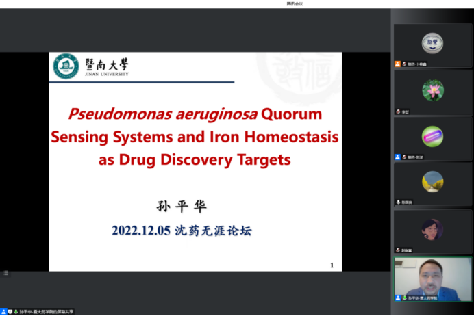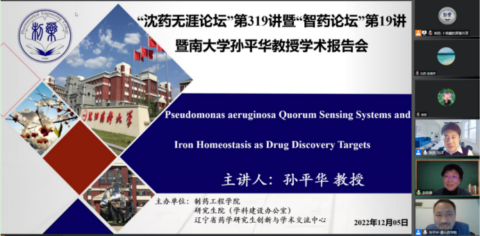 2022年12月5日下午,jdb电子中国官方网站、研究生院、辽宁省药学研究生创新与学术交流中心联合举办了“沈药无涯论坛”第319讲暨“智药论坛”第19讲,暨南大学孙平华教授作了题为“Pseudomonas aeruginosa Quorum Sensing Systems and IronHomeostasis as Drug Discovery Targets”的报告。会议由制药工程学科副主席刘洋教授主持,学院领导班子成员、全院研究生导师和研究生共300余人参会。