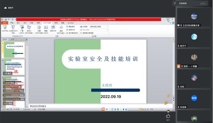 为强化研究生实验安全意识,提高个人防护能力,杜绝实验室安全事故的发生,9月19日,jdb电子中国官方网站通过线上会议的方式举行了“学习安全知识,筑牢安全长城”研究生实验安全教育讲座,特别邀请学院化学实验中心副主任王庆河担任主讲人。学院党委书记李哲、党委副书记刘阳、研究生辅导员杨艺宁、朱铭琳及全体研究生参加了本次讲座,讲座由学院研究生辅导员卜艳鑫主持。