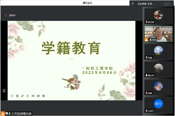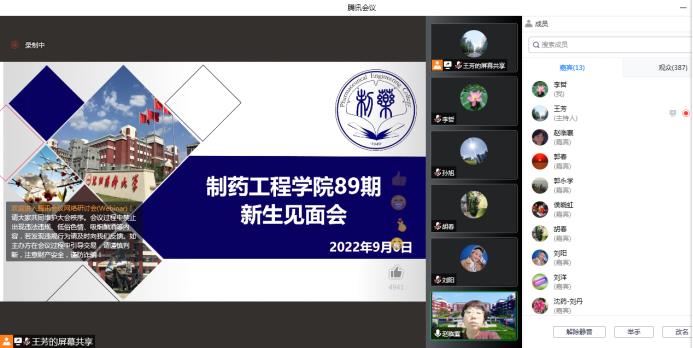 2022年9月6日晚,jdb电子中国官方网站依托腾讯会议召开了89期新生见面会。学院院长赵临襄、院党委书记李哲、副院长赵燕芳、副院长郭永学、副院长王绍宁、院党委副书记刘阳、院长助理刘洋、药物化学专业负责人郭春、环境科学专业负责人侯晓虹、应用化学专业负责人胡春、药物化学系主任刘丹、环境科学教研室主任张聪璐、教学秘书王芳以及89期1期队辅导员钟江妍出席了本次会议。会议由89期2期队辅导员孙旭主持,学院89期全体新生参加。