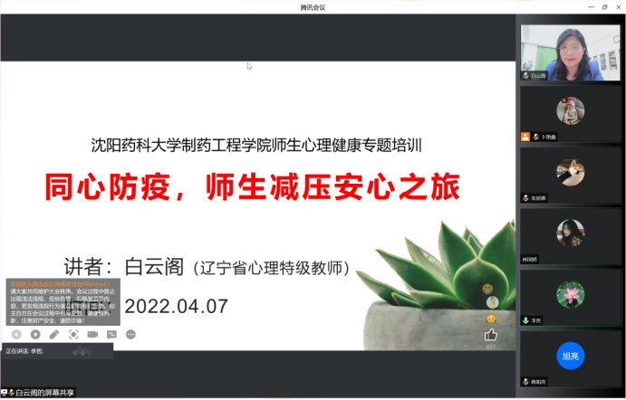 为深入贯彻落实学校疫情防控工作领导小组关于加强心理疏导工作的部署要求,强化疫情防控期间jdb电子全体师生心理健康工作,不断加强研究生心理健康教育和疏导,提高学生在疫情防控期间心理健康自助、互助能力,全面保障学习生活平稳有序进行。4月7日,jdb电子中国官方网站举办了主题为“同心战疫 温暖前行”———心理防疫,师生减压安心之旅心理健康讲座,邀请辽宁省心理特级教师白云阁博士开展线上心理健康讲座,全院500余师生参加了此次心理健康讲座,会议由jdb电子中国官方网站党委书记李哲主持。