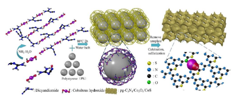 研究小组采用原位一步合成法,以聚苯乙烯纳米微球为模板,对石墨相氮化碳进行造孔,增加其比表面积,提高吸附性能和活性位点暴露量,同时均匀负载Co3O4;进而利用微波硫化法,对部分Co3O4进行硫化,提高材料电导率,使光生电子迅速转移,增强材料的光催化活性,最终获得材料pg−C3N4/Co3O4/CoS。基于该材料,构建了光催化−PMS氧化耦合体系,以双酚F(BPF)为目标物研究体系的催化降解效能。该合成方法操作简单、重复性好,获得的材料形貌均一,分离性能好,具有全光谱吸收性能,解决了氮化碳材料可见光响应不高、光生电子-空穴容易复合的问题。建立的光催化−PMS氧化耦合体系,实现了光电子的快速迁移,提高了过渡金属价态转换速率,且具有优异的抗基质干扰能力和有机物矿化能力(矿化率=90.6%)。