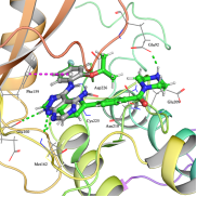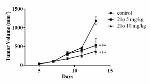 Figure 1. (A) Overlay of 21o (green stick) and CGP57380 (grey stick) within mutated MNK2 pocket (PDB ID: 2HW7); (B) Tumor growth rates during the treatment.