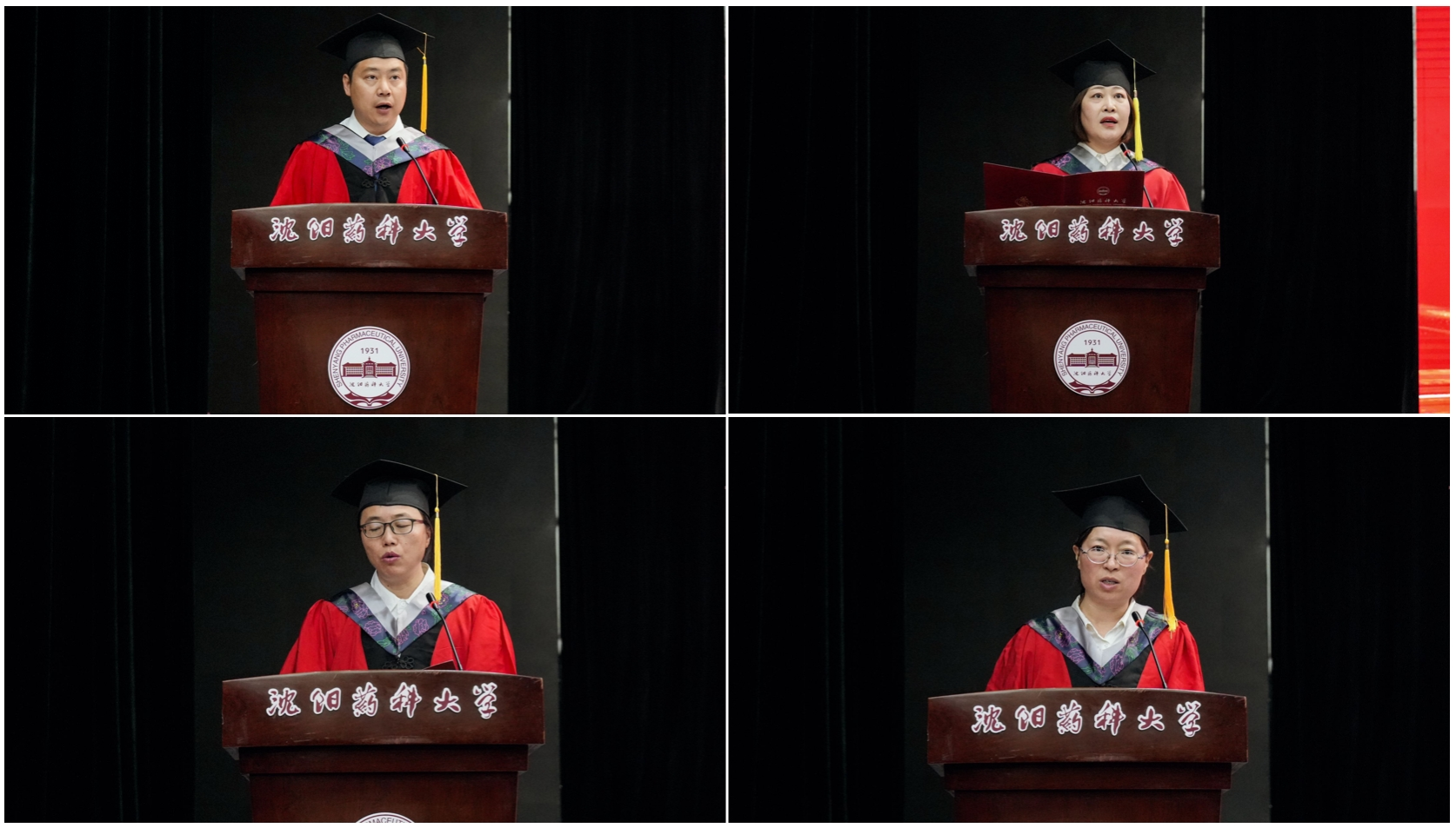 jdb电子中国官方网站院长刘洋教授宣读2024届博士学位授予名单;药物化学学科主席翟鑫教授、制药工程学科主席刘洋教授、化学学科主席王绍宁教授、化学工程与技术学科主席赵燕芳教授分别宣读各学科2024届硕士学位授予名单;制药工程专业负责人刘丹教授、药物化学专业负责人郭春教授、环境科学专业负责人张聪璐副教授、应用化学专业负责人胡春教授分别宣读2024届学士学位授予名单。