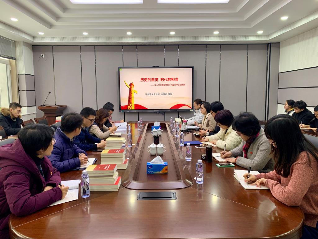 11月30日,jdb电子中国官方网站党委在制药楼227会议室召开理论学习中心组学习会,专题研讨深入学习贯彻党的十九届六中全会精神,特邀马克思主义学院形势与政策教研室徐雪松教授作《历史的自觉 时代的担当——深入学习贯彻党的十九届六中全会精神》专题讲座,学院领导班子成员、系主任、院工会主席、党支部书记、全体学生工作干部参会,会议由院党委书记李哲主持。