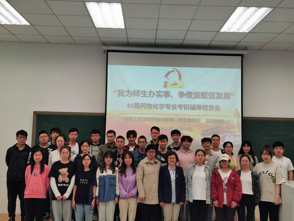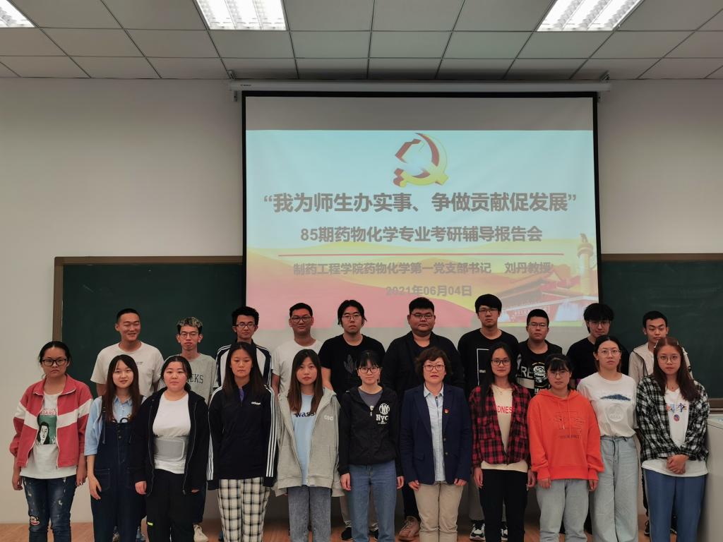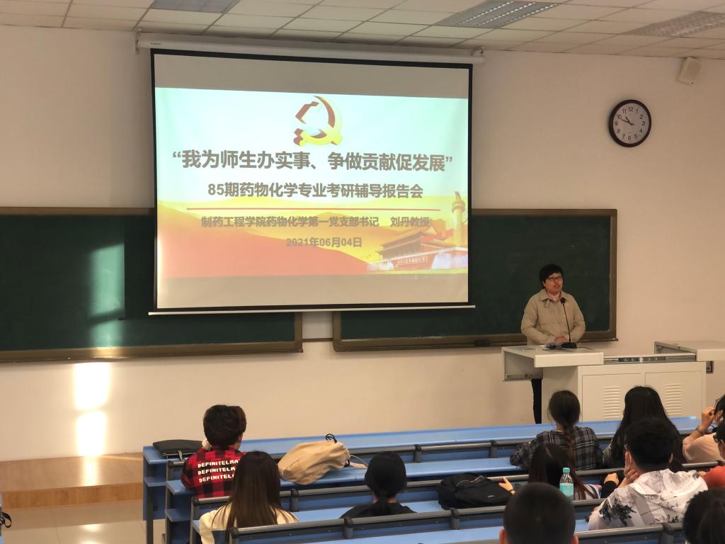 为更好地促进党史学习教育走深走实,充分发挥jdb电子中国官方网站药物化学第一党支部辽宁省高校“双带头人”教师党支部书记工作室的示范作用,将“我为师生办实事 争做贡献促发展”落到实处,6月4日晚,在第四教学楼204教室,药化第一党支部书记刘丹教授为85期药物化学专业学生做考研辅导报告,药化一班、药化二班共55名有意向参加考研的同学参与了此次考研指导会。院党委书记李哲出席并主持报告会。